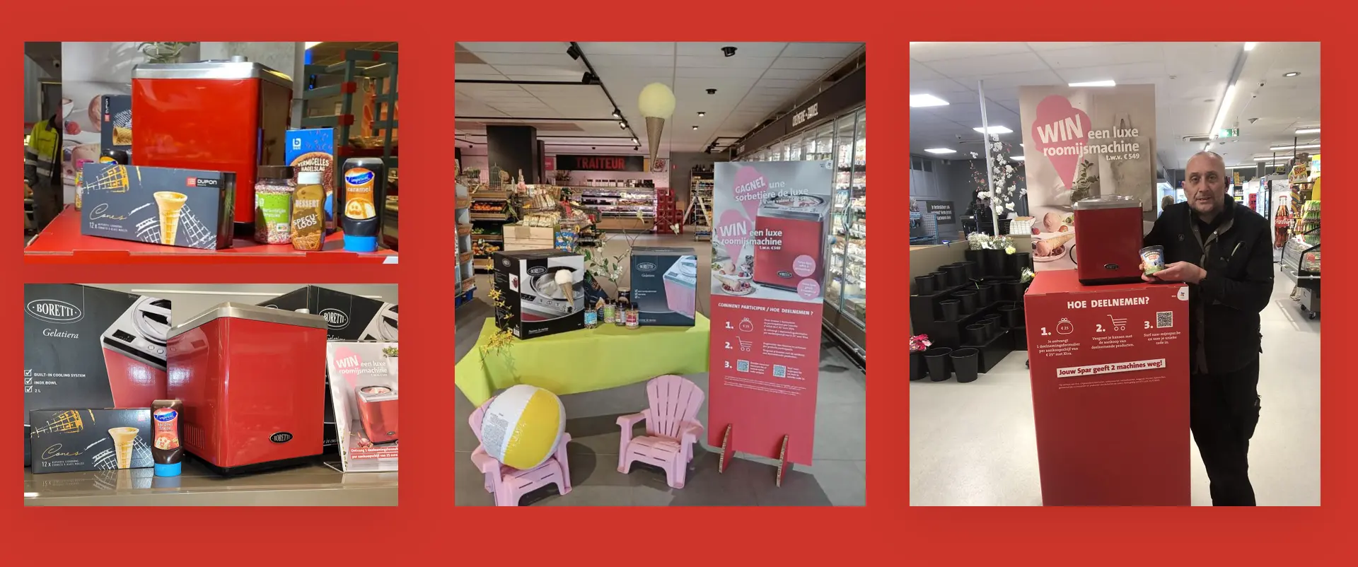 Les clients recevaient un bulletin de participation par tranche d’achat de 25 € ou à l’achat de produits participants. Grâce au code unique figurant sur leur bulletin de participation, ils pouvaient participer au concours sur monspar.be. Chacun de nos magasins Spar offrait 1 (petits magasins) ou 2 (grands magasins) sorbetières.